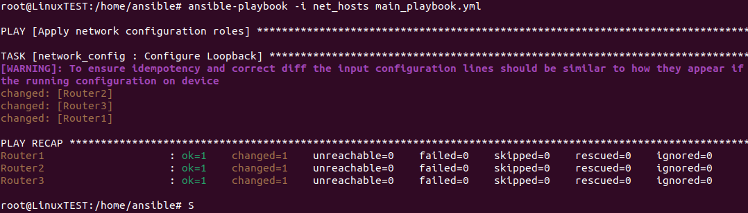 ansible-playbook -i net_hosts main_playbook.yml コマンドでプレイブックを実行します。