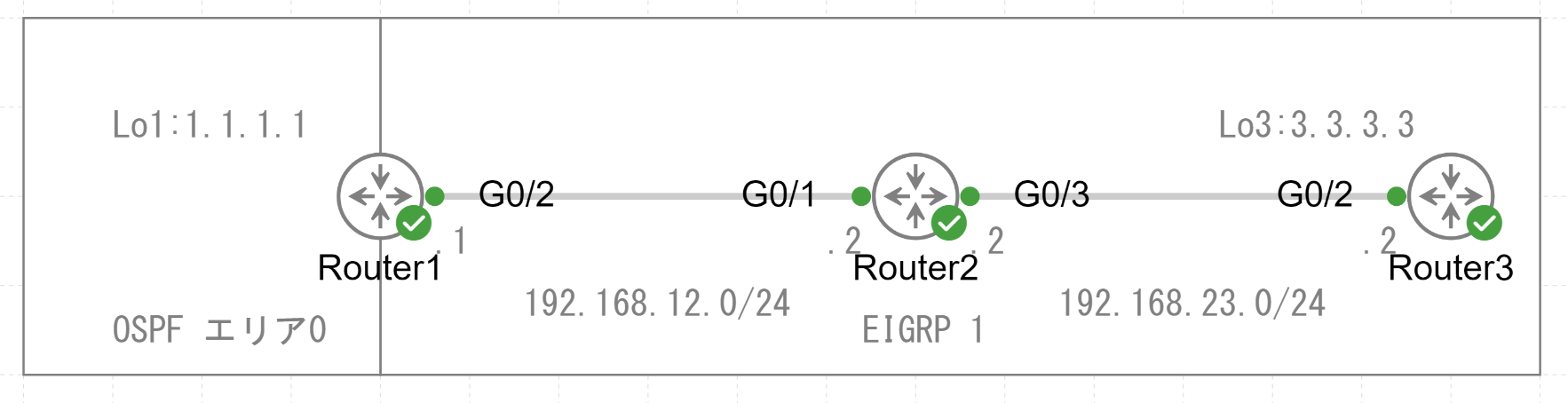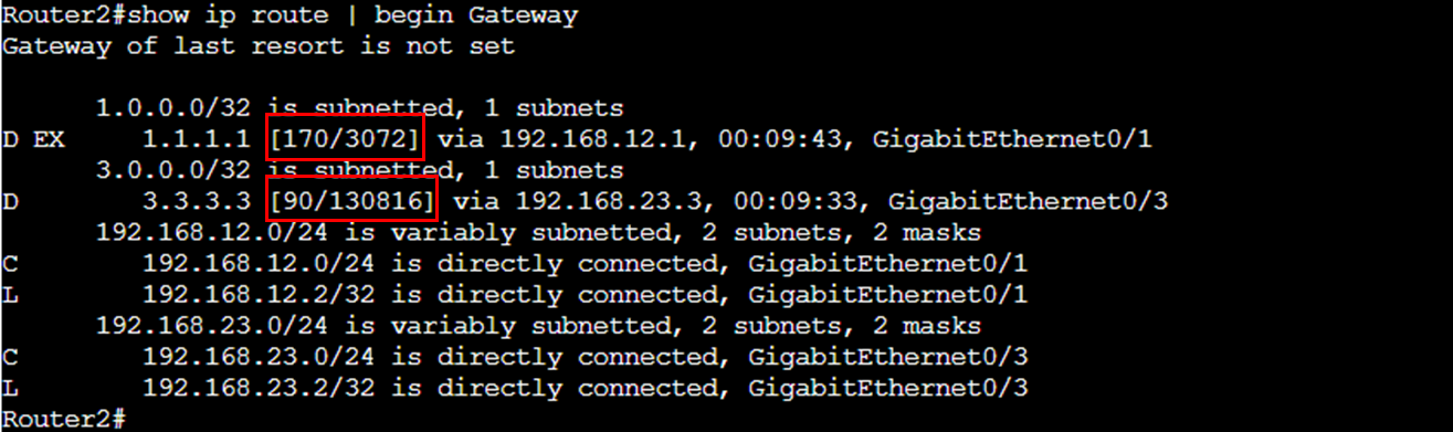 Router2ではEIGRP内部の3.3.3.3のルート情報のAD値が90、OSPFから再配布された1.1.1.1のルート情報のAD値が170となっています。