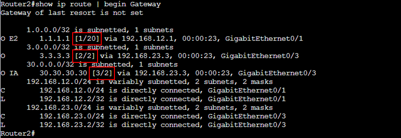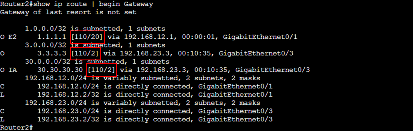 Router2ではEIGRPから再配布された1.1.1.1のルート情報、エリア1の30.30.30.30のルート情報、同じエリアの3.3.3.3のルート情報があります。すべてAD値は110となっています。