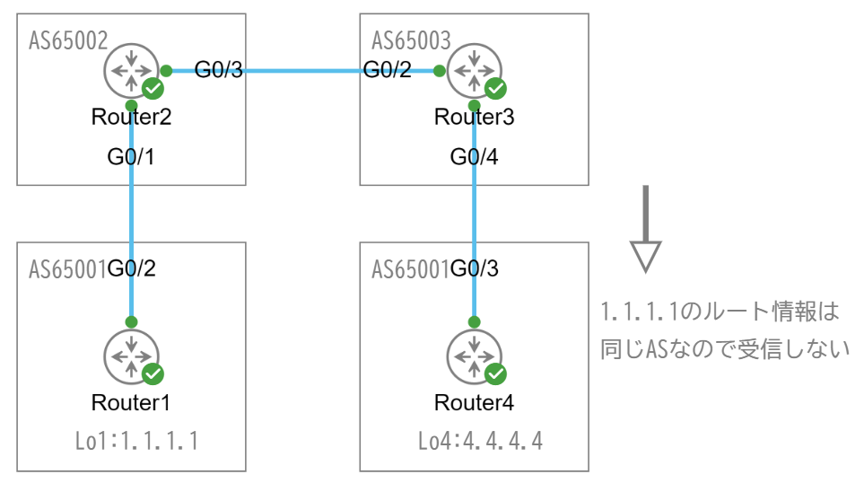 BGPは、ルートがループして無限に回らないように、ASパスループ防止メカニズムを持っています。このメカニズムでは、ルートのASパスに自分のAS番号が含まれている場合、そのルートは無効と見なされ、破棄されます。これにより、同じAS内でルートが何度も繰り返し伝播されることを防ぎます。