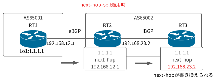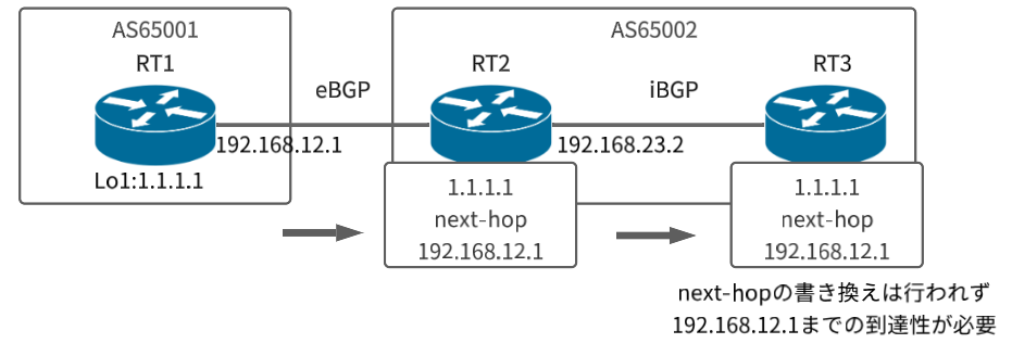 - eBGPピア間でルート情報が交換される際、Next-Hop属性はBGPピアのIPアドレスに置き換えられます。これは、ルートをアドバタイズするルーター自体がそのルートのNext-Hopであるためです。