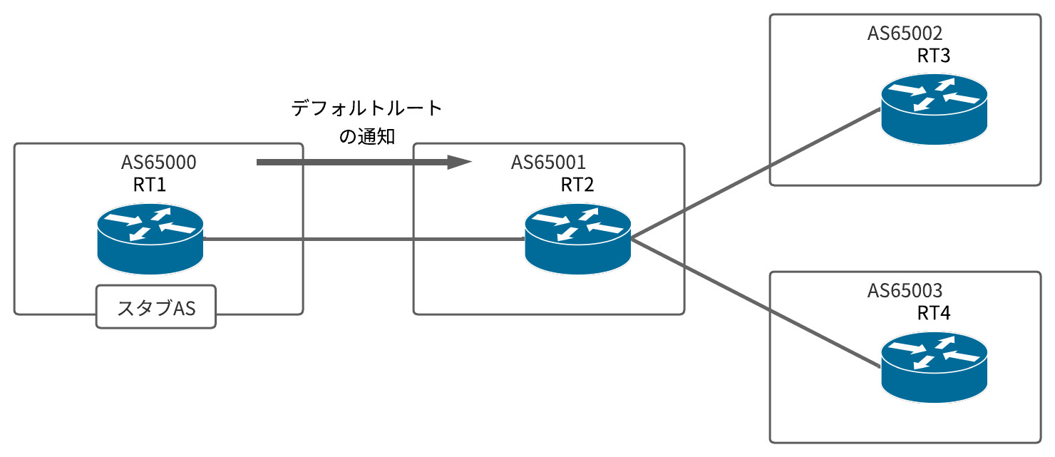 非トランジットASは複数のASに対して他ASのルート情報をアドバタイズしないASのことを指します。RT1はRT2を経由してRT4に通信することができません。非トランジットASは自ASのルート情報のみアドバタイズします。