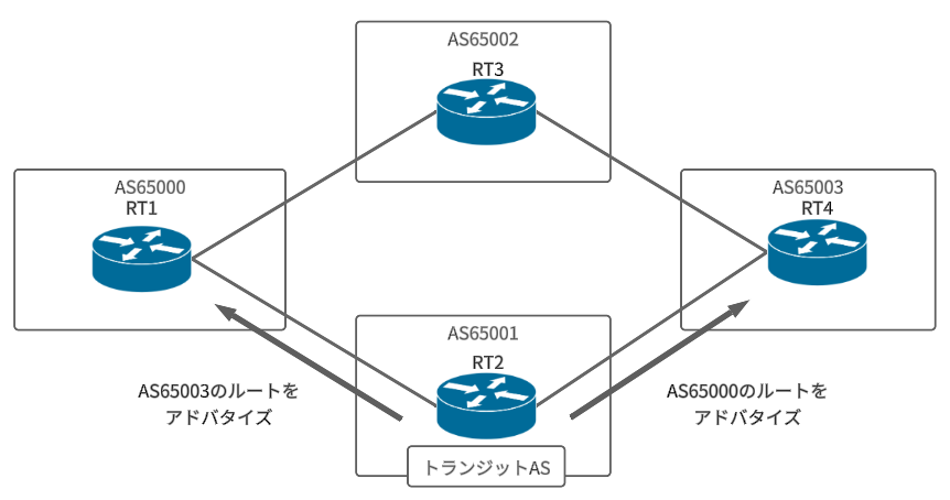 トランジットASは複数のASに対して他ASのルート情報をアドバタイズするASのことを指します。RT1はRT2を経由してRT4に通信することができます。ほかのAS形態と同じく自ASのルート情報もアドバタイズします。
