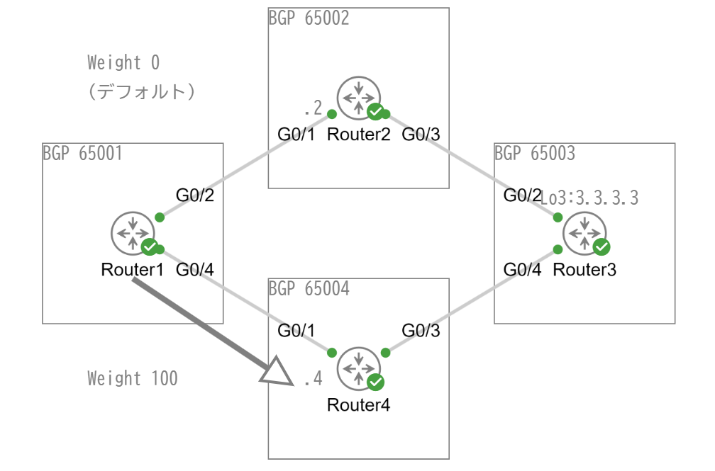 - Weightは、BGPルーターの内部でのみ使用されます。他のBGPピアに対してこの属性は伝播されません。つまり、Weightの設定はそのルーターでのルート選択にのみ影響を与えます。
