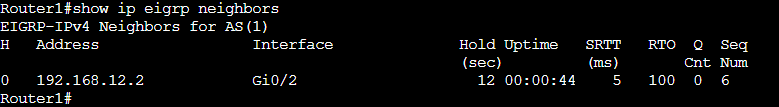 *Sep 14 10:09:28.426: %DUAL-5-NBRCHANGE: EIGRP-IPv4 1: Neighbor 192.168.12.1 (GigabitEthernet0/1) is up: new adjacency