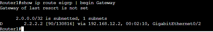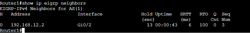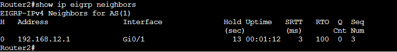 「show ip eigrp neighbors」コマンドを使用して、Router1とRouter2でネイバー関係が確立していることを確認できます。