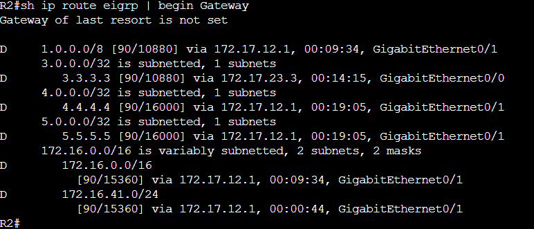 現在172.16.41.0/24と172.16.51.0/24のルート情報が172.16.0.0/16にルート集約されて、R2では集約されたルートのみが表示されています。