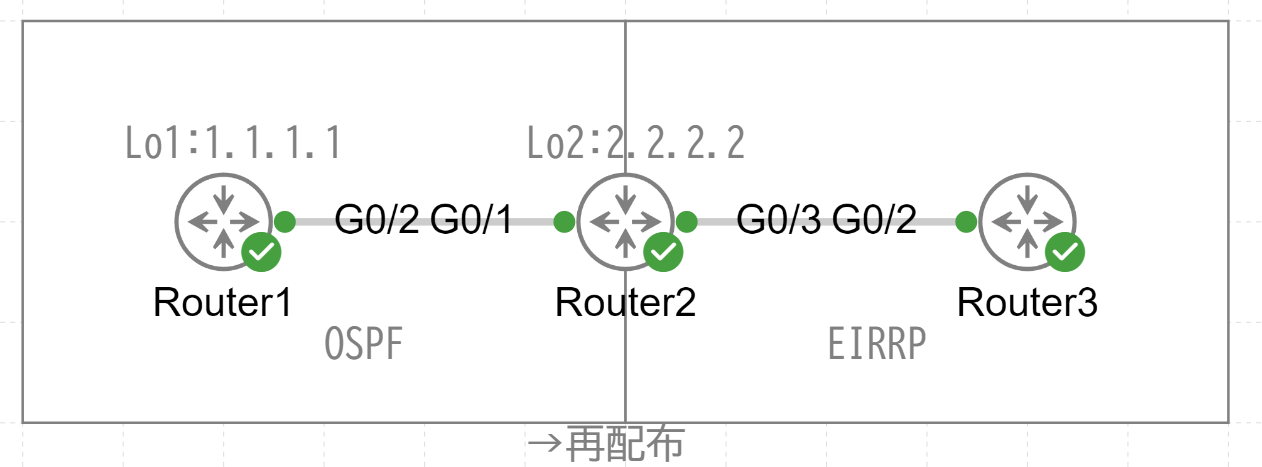 Router2は自身のLo2:2.2.2.2のルート情報に加えて、Router1のLo1:1.1.1.1、192.168.12.0/24のOSPFルートをEIGRPに再配布してRouter3にアドバタイズしています。