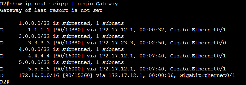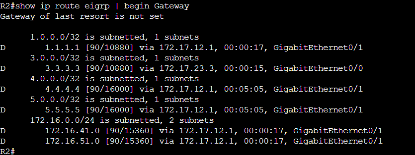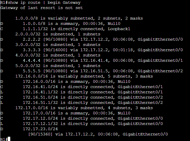 172.16.0.0/16のなかでネットワークに存在するセグメントは172.16.41.0/24と172.16.51.0/24だけです。これ以外のセグメントの宛先はEIGRPトポロジ内には存在しないので、破棄するようネクストホップがnullのルート情報が追加されます。