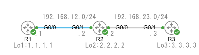下記構成でそれぞれのルータはEIGRPでネイバー関係にある状態です。
