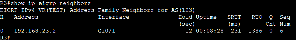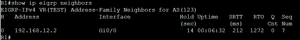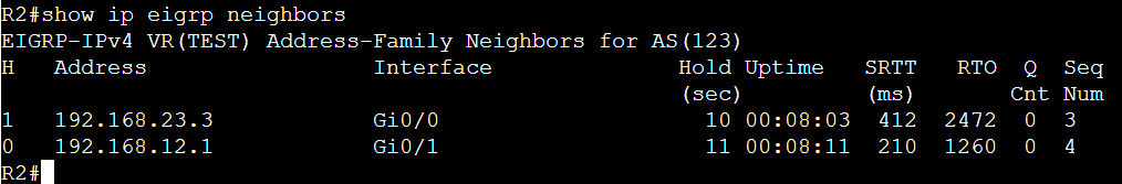 show ip eigrp neighborsで表示されます。
