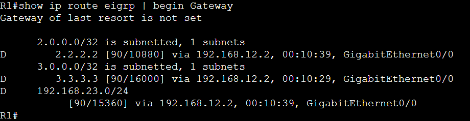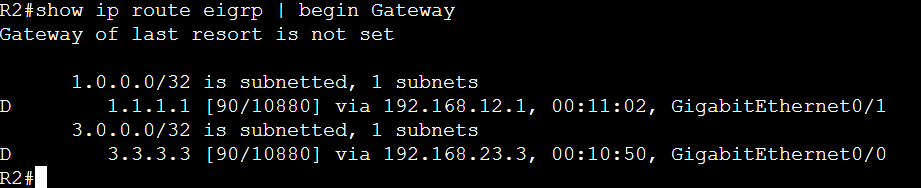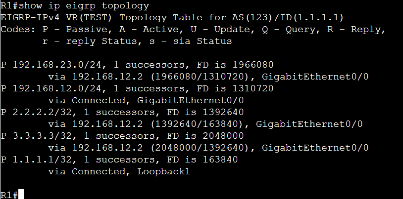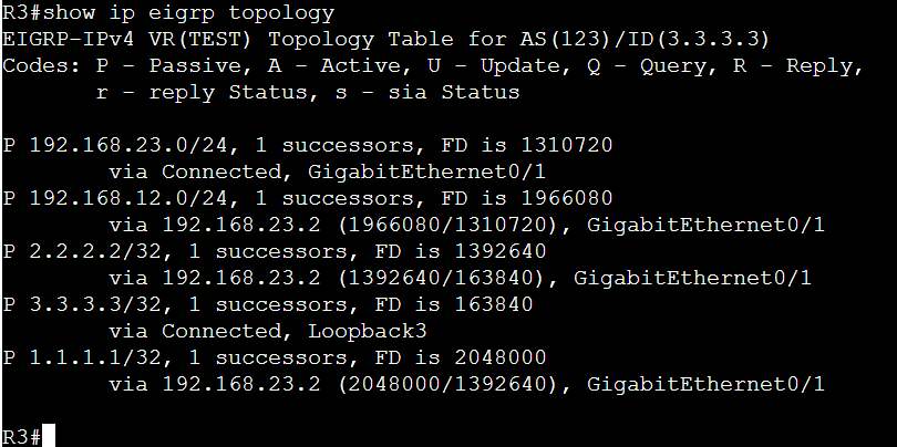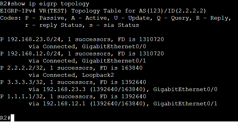 show ip eigrp topologyコマンドによって、各ルータがEIGRPプロセスを通じて受信したすべてのルート情報を確認することが出来ます。