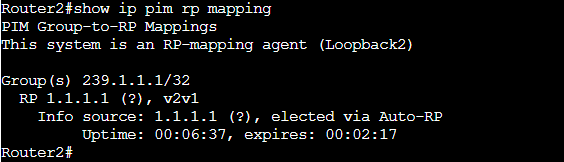Router2(config)#ip pim send-rp-discovery loopback2 scope 16