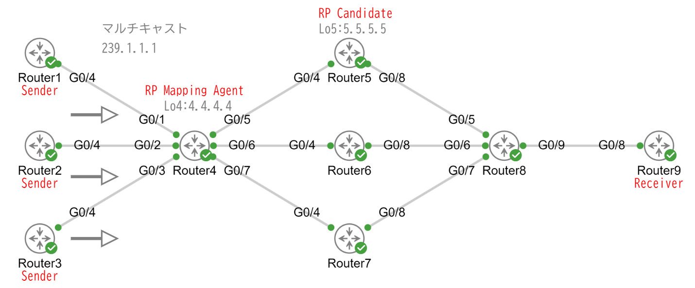 現状Router1からマルチキャストアドレス239.1.1.1の通信はすべてGi0/7(Router7)を経由するようにルーティングされています。