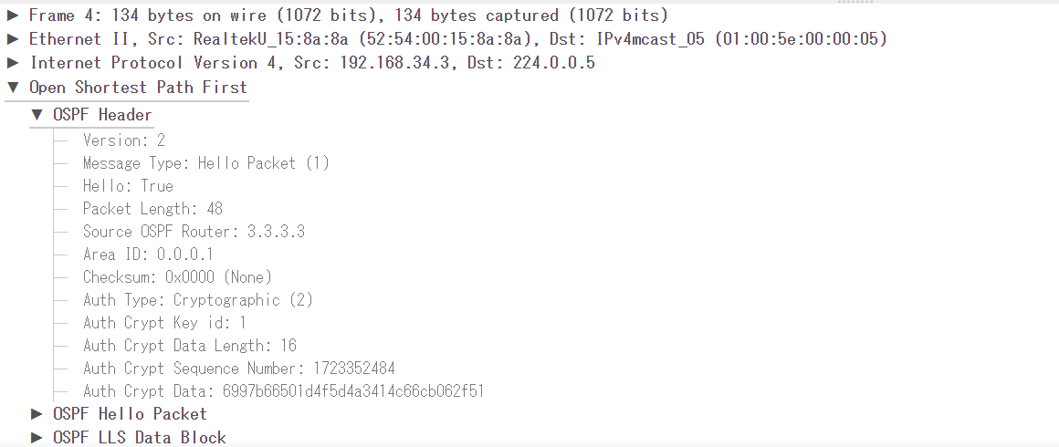 パケットキャプチャを確認すると暗号化された状態でOSPFのヘッダーに格納されていることが分かります。