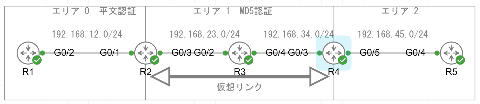 R2でエリア0の認証を設定すると自動的に仮想リンクでも認証設定が有効化されてしまうので、ネイバーがダウンしてしまいます。