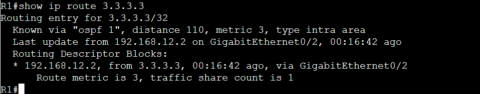 costが低いIFが優先されるため、R3までの通信はGi0/2のIFが使用されます。