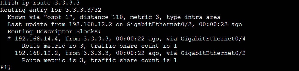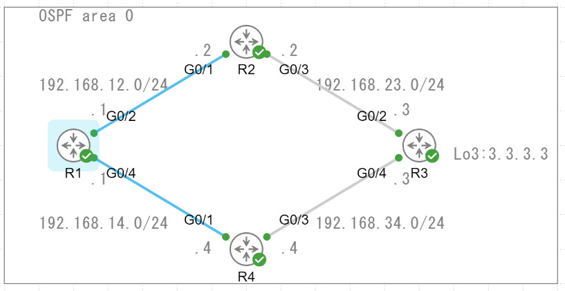 上図の構成の場合、R1からR3のLoアドレス:3.3.3.3までの通信経路はGi0/2とGi0/4から出力する2つの経路がありますが、どちらも同じ帯域なので等コストとなるので2つのIFから通信されます。