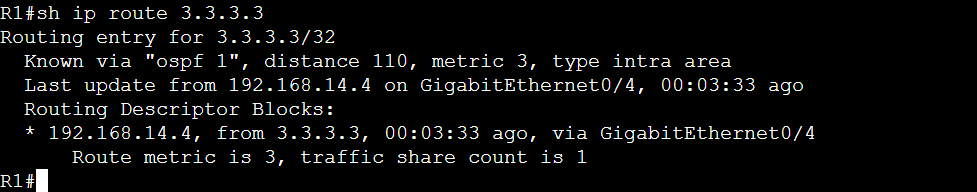 コストがGi0/4は1、Gi0/2は10になったことにより、コストが低い方が優先されるのでR3までの通信経路はGi0/4のみとなりました。