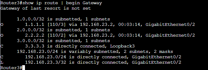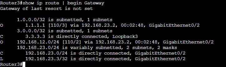 Router3でLoopback2のセグメントをアドバタイズしなくなったのでRouter3のルーティングテーブルからLoopback2の2:2:2:2に関するルーティング情報が消えています。