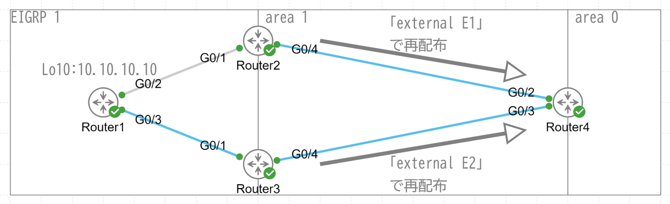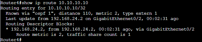 Router4で10.10.10.10までの経路を確認すると、エクスターナル1ルートであるRouter2経由の通信を選択しています。