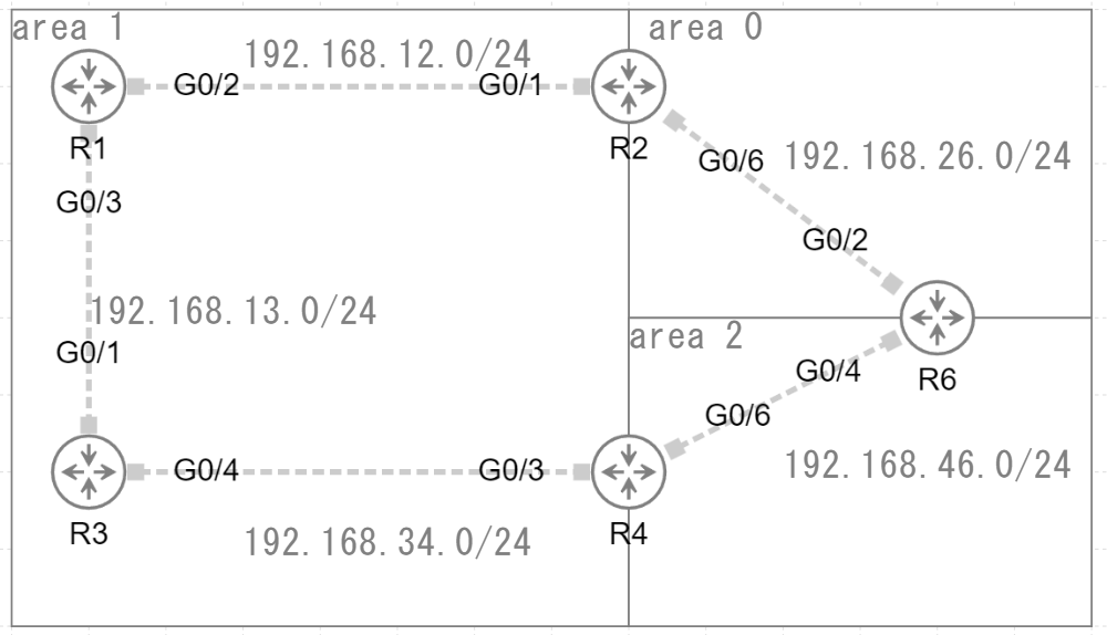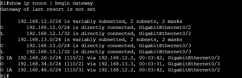 R1はルーティングテーブルを確認すると、192.168.34.0/24までの通信はGi0/3から通信されます。これは同じエリア内から学習されたルートを優先するためです。