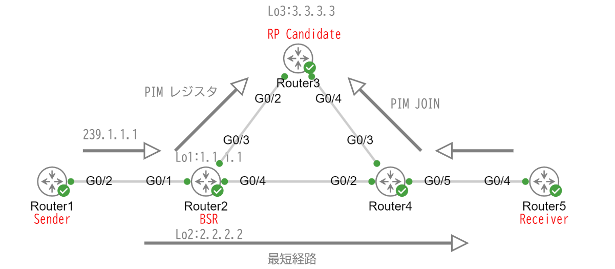 特定のルーターがBSRとして選出され、ネットワーク内のRP候補(C-RP, Candidate RP)を管理し、その情報をPIMドメイン全体に広めます。BSRは、C-RP情報を集め、適切なRPを選定します。 - Candidate RP (C-RP)