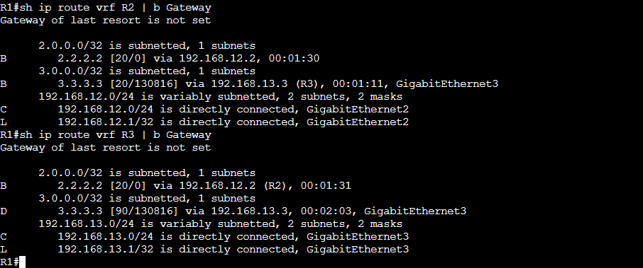 ②VRF R2とVRF R3のBGP間については、前段のVRF定義の設定でルート情報の共有が完了しているので、結果的にVRF R3のEIGRPからVRF R2のBGPにルート情報を再配布されます。