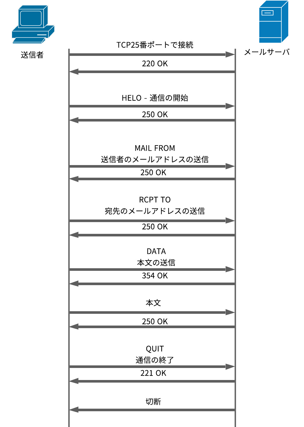 SMTP(Simple Mail Transfer Protocol)とは、メールを送信するためのプロトコルです。ポート番号はTCPの25番ポートを使用しています。