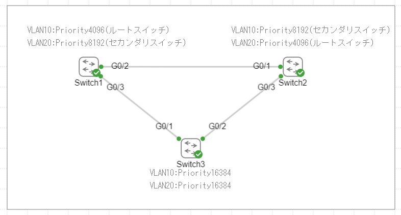 具体的に下記トポロジのSwitch1とSwitch3の間の通信においてどのようなSTPパケットが流れているか確認をします。