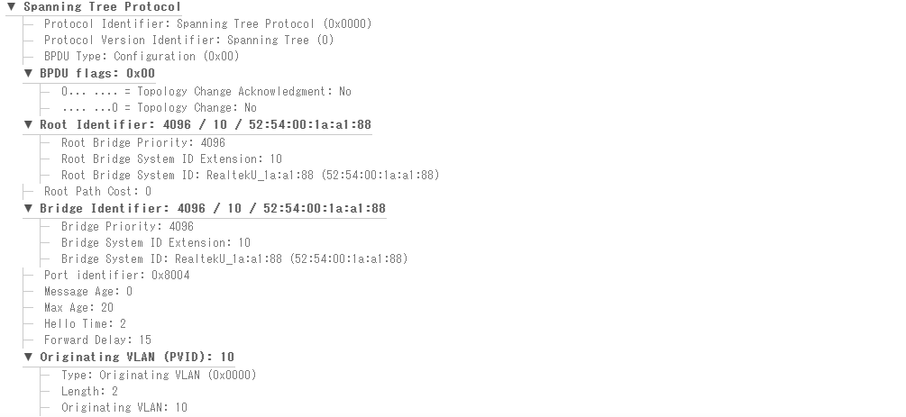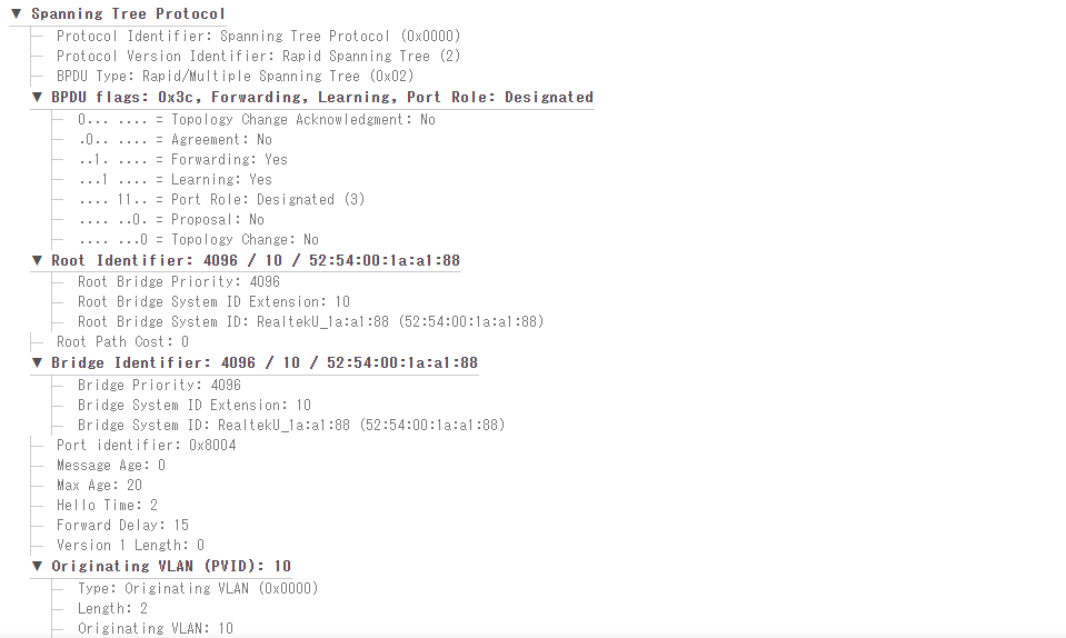 | BPDU Type | 1 | BPDUのタイプを示します。0x00はConfiguration BPDU、0x02はRSTP BPDUを示します。 |
