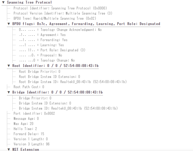 CSTと接続用に使用される個所はバージョンが3になっていること以外はほとんどRSTPの中身と同じです。一番下にMST Extensionというフィールドが追加されています。