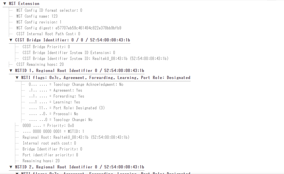 | MSTI flags | 1 | ◆TCA:トポロジ変更の確認 (Topology Change Acknowledgment) を示すフラグ。 ◆Agreement:合意 (Agreement) を示すフラグ。。 ◆Forwarding:フォワーディング状態 (Forwarding State) を示すフラグ。 ◆Learning:学習状態 (Learning State) を示すフラグ。 ◆Port Role:ポートの役割 (Port Role) を示すビットフィールド (2ビット)。 このフィールドは、ポートが現在持っている役割を示します。 ポートの役割には以下の種類があります ・ 0 Unknown ・1 Alternate/Backup Port(代替/バックアップポート) ・2 Root Port(ルートポート) ・3 Designated Port(指定ポート) ・11: 不使用(Reserved) ◆Proposal:プロポーザル (Proposal) を示すフラグ。 ◆TC:トポロジ変更 (Topology Change) を示すフラグ。 |