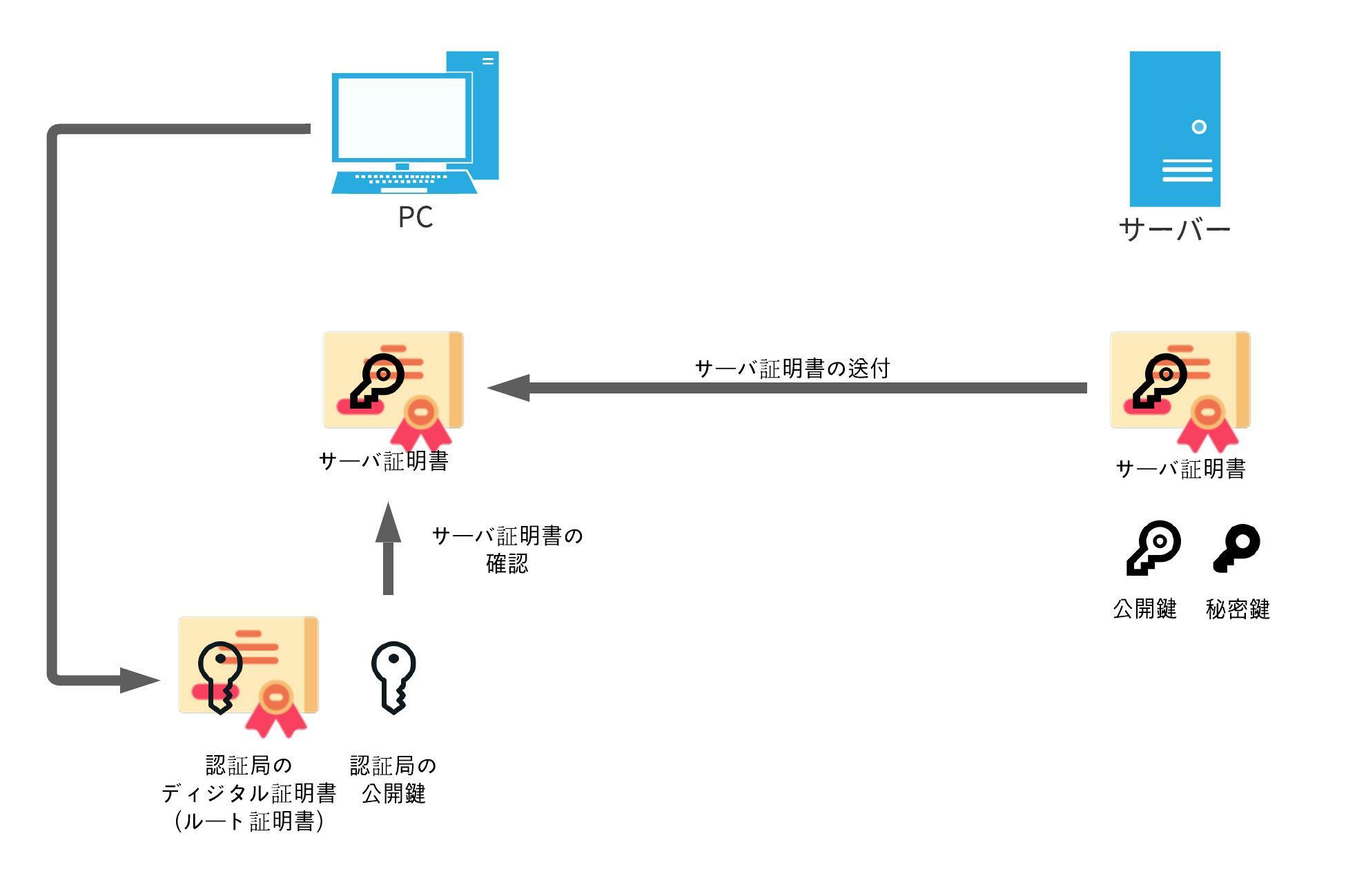 認証局の公開鍵でサーバー証明書のディジタル署名を複合して正規のサーバーであることを確認します。