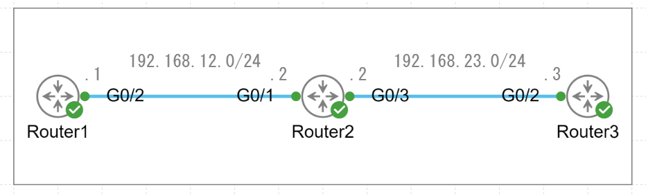 Router1から192.168.23.0/24までのルーティング情報を付与することで、Router3まで通信することが出来るようになりました。
