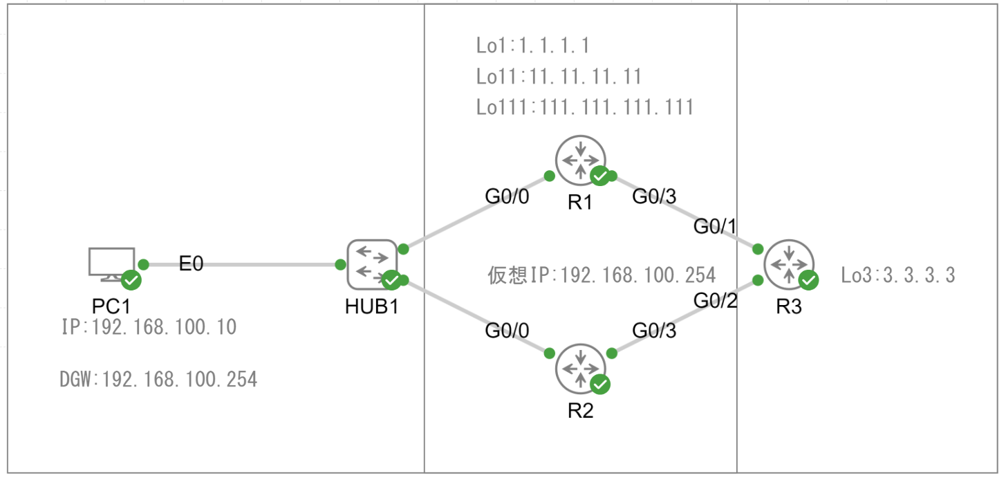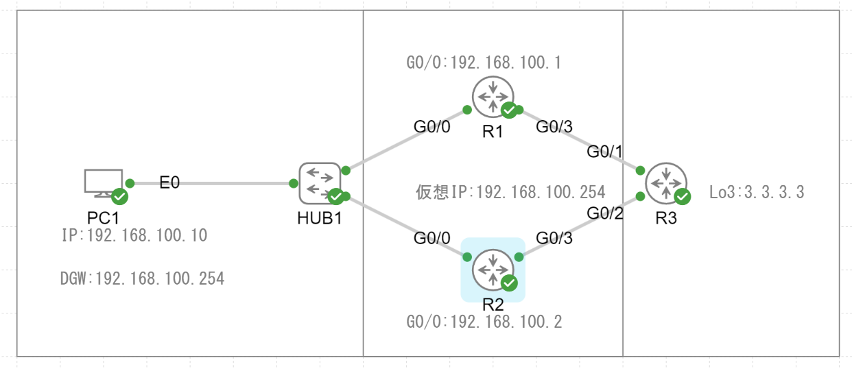 R1,R2から3.3.3.3までの到達性がダウンするとオブジェクトトラッキングが動作してHSRPのプライオリティを10下げるように設定しています。