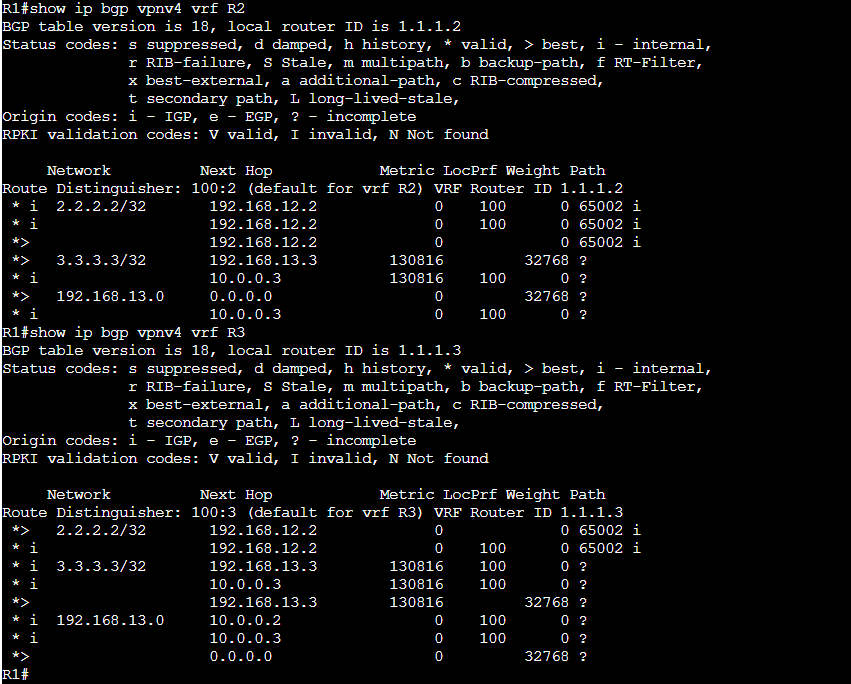 VRFのBGPテーブル情報を確認します。同じくVRF R2ではVRF R3の3.3.3.3の情報、VRF R3ではVRF R2の2.2.2.2の情報が確認できます。